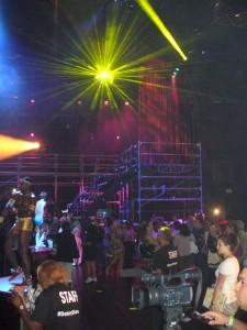 He has commandeered the massive Wolfson Stage and wings of the Ziff Ballet Opera House, used the huge show curtain as the back wall and turned the stage itself into the Oberon Club where audience and performers mingle, a set up akin to Fuerza Bruta. The walls are lined with scaffolding and tiered risers surrounding a dance floor. A long platform lined against the curtain is the primary performing area, but large silver cubes dot the dance floor for additional playing spaces.