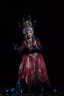 The production values include lavish fanciful costumes and fluid if simple sets, both rented from the New York City Opera. The queen’s headdress has enough sparkling surfaces that the audience’s eyes are dazzled as if she was a walking glitter ball. For counterpoint, Pamina wears a 1950’s party dress; Tamino spends much of the evening in pajamas and then dons blue jeans and gym sneakers.