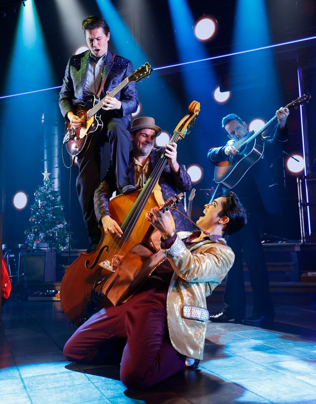 Sky Seals plays Johnny Cash, “The Man in Black,” as he has done over a reported 1000 times since 2016. Chance Michael Wall is Carl Perkins, “The King of Rockabilly,” coming to the stage after music directing Million Dollar Quartet elsewhere and now doing the same here. Daniel Durston, a former contestant on Big Brother, is an Elvis, “The King of Rock and Roll.” Durston is a tribute artist in Las Vegas with a cool replica of Presley’s Martin D-28 mahogany carved guitar.