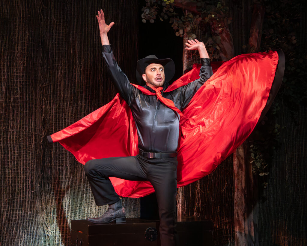 In an outfit that Antonio Banderas would easily be caught dead in, El Gallo takes the stage in a black cape with a red lining and a wingspan to die for. Other costumes are old-fashioned and ethereal-looking in muted colors, with Matt and Luisa looking like the boy and girl in a fairy tale should. The fathers are equally pinch their cheeks adorable in their matching trousers, vests, and hats. And Henry’s mismatched socks did not go unnoticed. Actor’s choice, or a clever move by Costume Designer Kimberly Wick?