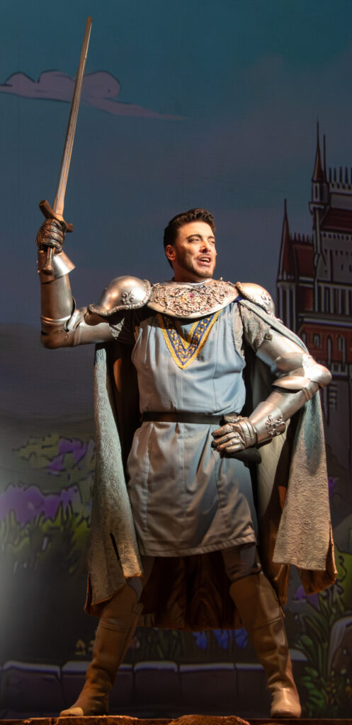 There’s an elegant full-circle moment for Luttrell, who is certainly having a moment as the go-to Robert Goulet in town, first playing El Gallo and now Lancelot, two of Goulet’s most beloved characters. Lancelot, aptly named as it turns out, makes his entrance with all the conviction of a man who fully intends to live up to a moniker Monty Python would be jealous of (Lance-a-lot). Stepping into the part requires a certain physical presence, and yes, Luttrell is handsome, but thankfully not only that.