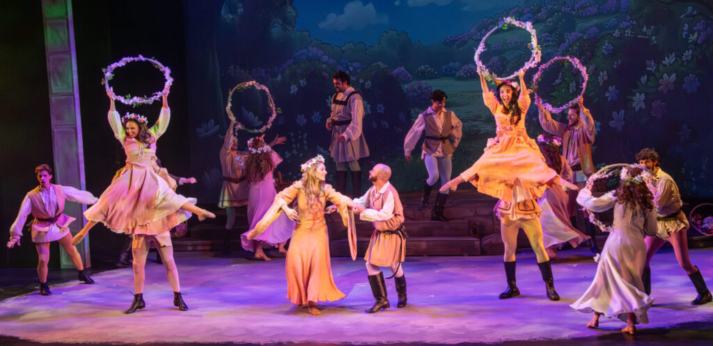 The haunting “Follow Me” as performed by Aaron Bower as Nimue as she whisks Merlyn away is enchanting. “The Joust” reminds us a more playful “Ascot Gavotte.” “Fie on Goodness” which loosely means “damn goodness” entertains with shirtless knights and fight choreography by Julian Perez, an expert in stage combat training. And “What Do the Simple Folk Do?” with Martinez and Rosenblum as Arthur and Guenevere is clever and cute as Martinez whistles, and they dance together like children.